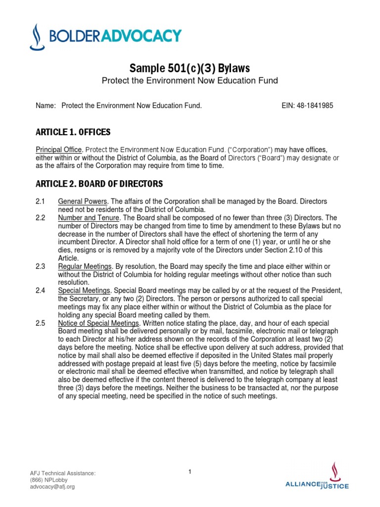 Sample 501c3 Bylaws Board Of Directors Indemnity