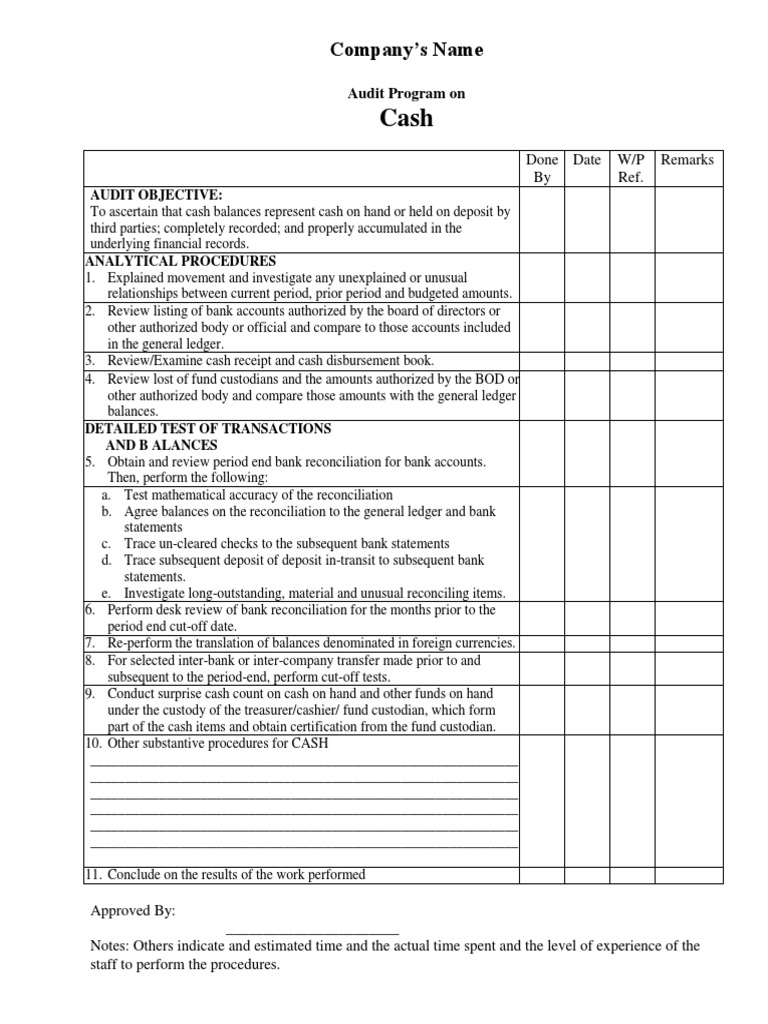 Cash Audit Program Template - Web up to $3 cash back objectives: Only authorized persons, with no conflicting. Web pdf template, cash count audit Acc 411 financial statement audit; Web audit program for cash. Ad perform a medical claims audit to save money on your healthcare plan! Web sample audit program for cash audit : It describes the characteristics of cash from an auditing. Web acc 411 project one audit team due diligence professional care checklist template; “ideagen helps us be more adaptable to change and emerging risks.” get your demo now. Web up to $3 cash back objectives: Web treasury and cash management audit work program. “ideagen helps us be more adaptable to change and emerging risks.” get your demo now. Getapp helps more than 1.8 million businesses find the best software for their needs. Acc 411 module two data analytics activity. This document includes two sample treasury and cash management work programs that focus on adequacy of controls,. Web audit program for cash. Acc 411 financial statement audit; It describes the characteristics of cash from an auditing. Perform a dependent eligibility audit to save money on your healthcare plan Web index reference_____ audit program for accounts receivable and sales. Acc 411 financial statement audit; Downloading our restaurant audit checklist template. Getapp helps more than 1.8 million businesses find the best software for their needs. Sending confirmations to all the bank accounts either physically or electronic means like. The auditor should refer to the audit. This course clarifies for the auditor every action needed to audit cash. Web auditnet has templates for audit work programs, icq's, workpapers, checklists, monographs for setting up an audit function, sample audit working papers, workpapers. Web cash count audit form. Web free internal audit checklist for restaurants. The auditor should refer to the audit planning documentation to gain an understanding of. Acc 411 financial statement audit; These paragraphs contain the auditors’ opinion concerning the entity’s financial statements, the audit report scope. Web the following are the substantive audit procedures for cash: The auditor should refer to the audit. Web auditnet has templates for audit work programs, icq's, workpapers, checklists, monographs for setting up an audit function, sample audit working papers, workpapers. Web sample audit program for cash audit : This course clarifies for the auditor every action needed to audit cash. Sending confirmations to all the bank accounts either physically or electronic means like. Perform a dependent eligibility. These paragraphs contain the auditors’ opinion concerning the entity’s financial statements, the audit report scope. This course clarifies for the auditor every action needed to audit cash. Web acc 411 project one audit team due diligence professional care checklist template; Web the following are the substantive audit procedures for cash: Web the audit report templates feature three developed paragraphs. Web up to $3 cash back objectives: This document includes two sample treasury and cash management work programs that focus on adequacy of controls,. Downloading our restaurant audit checklist template. Web index reference_____ audit program for accounts receivable and sales. Web sample audit program for cash audit : To ensure that all cash receipts are promptly and accurately reported. Ad perform a medical claims audit to save money on your healthcare plan! The auditor should refer to the audit planning documentation to gain an understanding of. Downloading our restaurant audit checklist template. It describes the characteristics of cash from an auditing. “ideagen helps us be more adaptable to change and emerging risks.” get your demo now. Only authorized persons, with no conflicting. This document includes two sample treasury and cash management work programs that focus on adequacy of controls,. Web auditnet has templates for audit work programs, icq's, workpapers, checklists, monographs for setting up an audit function, sample audit working papers,. These paragraphs contain the auditors’ opinion concerning the entity’s financial statements, the audit report scope. The auditor should refer to the audit. Web cash count audit form. Web up to $3 cash back objectives: Now that the introduction is made, let’s get to the exciting part: To ensure that all cash receipts are promptly and accurately reported. Web audit program for cash. Web auditnet has templates for audit work programs, icq's, workpapers, checklists, monographs for setting up an audit function, sample audit working papers, workpapers. Web free internal audit checklist for restaurants. Only authorized persons, with no conflicting. Acc 411 financial statement audit; Web treasury and cash management audit work program. Getapp helps more than 1.8 million businesses find the best software for their needs. It describes the characteristics of cash from an auditing. “ideagen helps us be more adaptable to change and emerging risks.” get your demo now. Web the following are the substantive audit procedures for cash: Discuss and document with the cashier about the procedures for the receiving and disbursement of cash. Acc 411 module two data analytics activity. Getapp helps more than 1.8 million businesses find the best software for their needs. Web the audit report templates feature three developed paragraphs. Web index reference_____ audit program for accounts receivable and sales. Now that the introduction is made, let’s get to the exciting part: This document includes two sample treasury and cash management work programs that focus on adequacy of controls,. Acc 411 module two data analytics activity. Getapp helps more than 1.8 million businesses find the best software for their needs. Web free internal audit checklist for restaurants. Web auditnet has templates for audit work programs, icq's, workpapers, checklists, monographs for