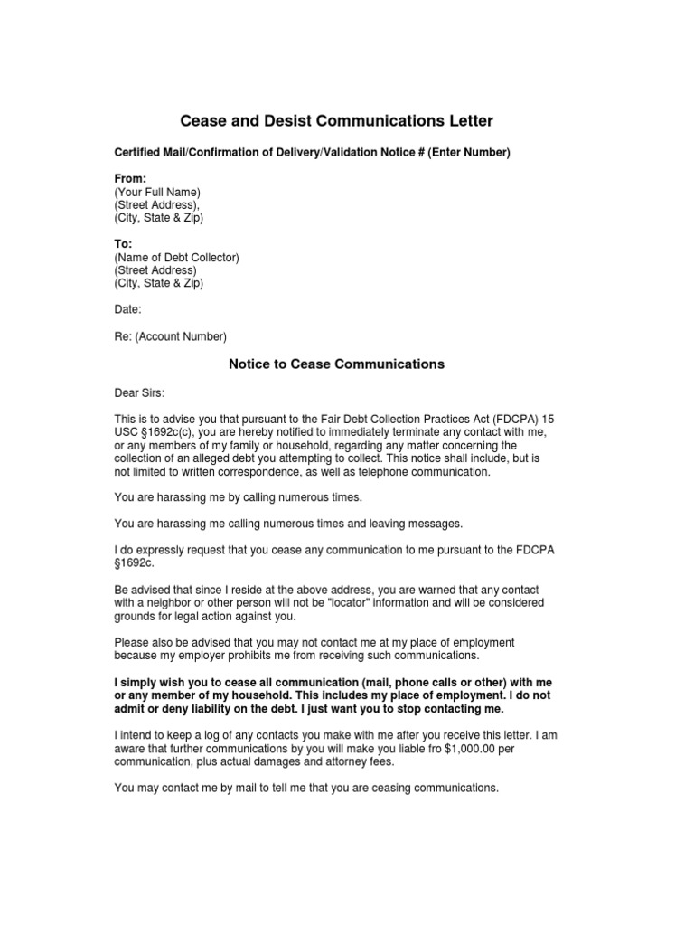 Web A Debt Collector Cease And Desist Letter Informs A Creditor To Halt All Mobile Communication Through Their Domicile Either Work Number.