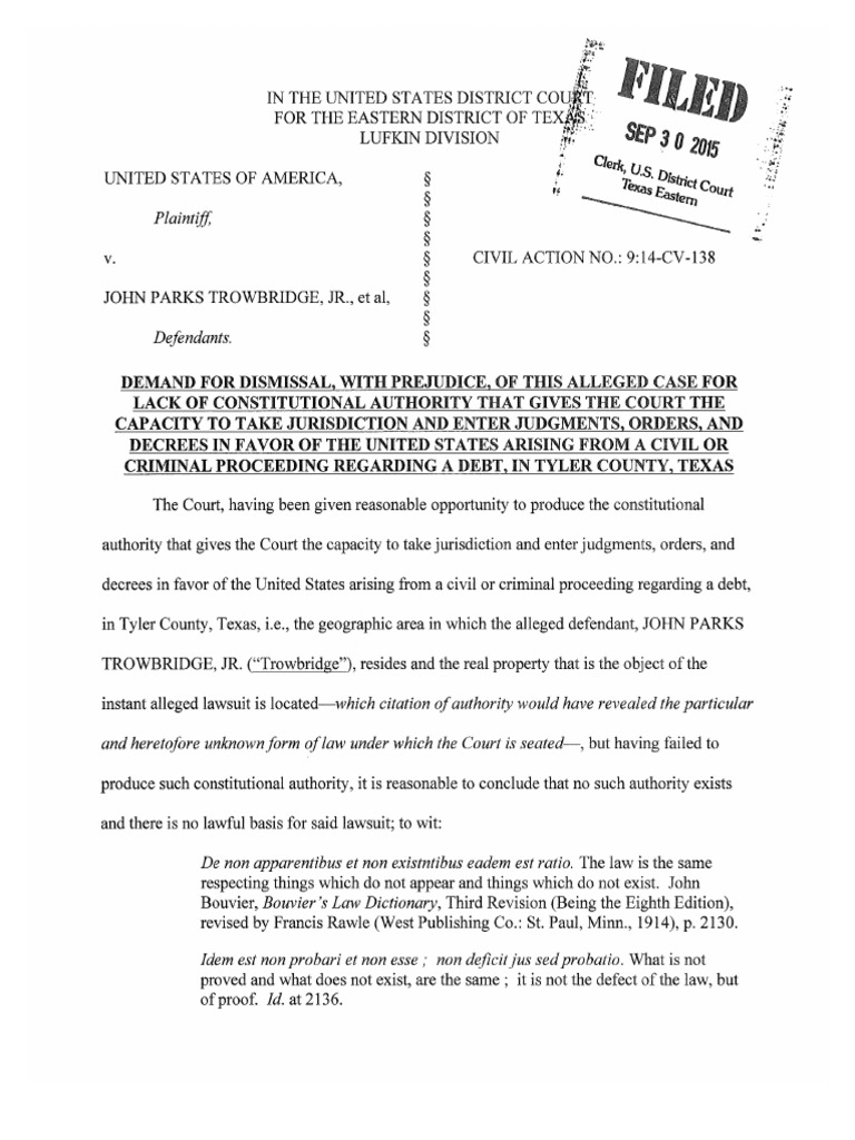 Demand for Dismissal Filed 093015 Lawsuit Jurisdiction Free 30