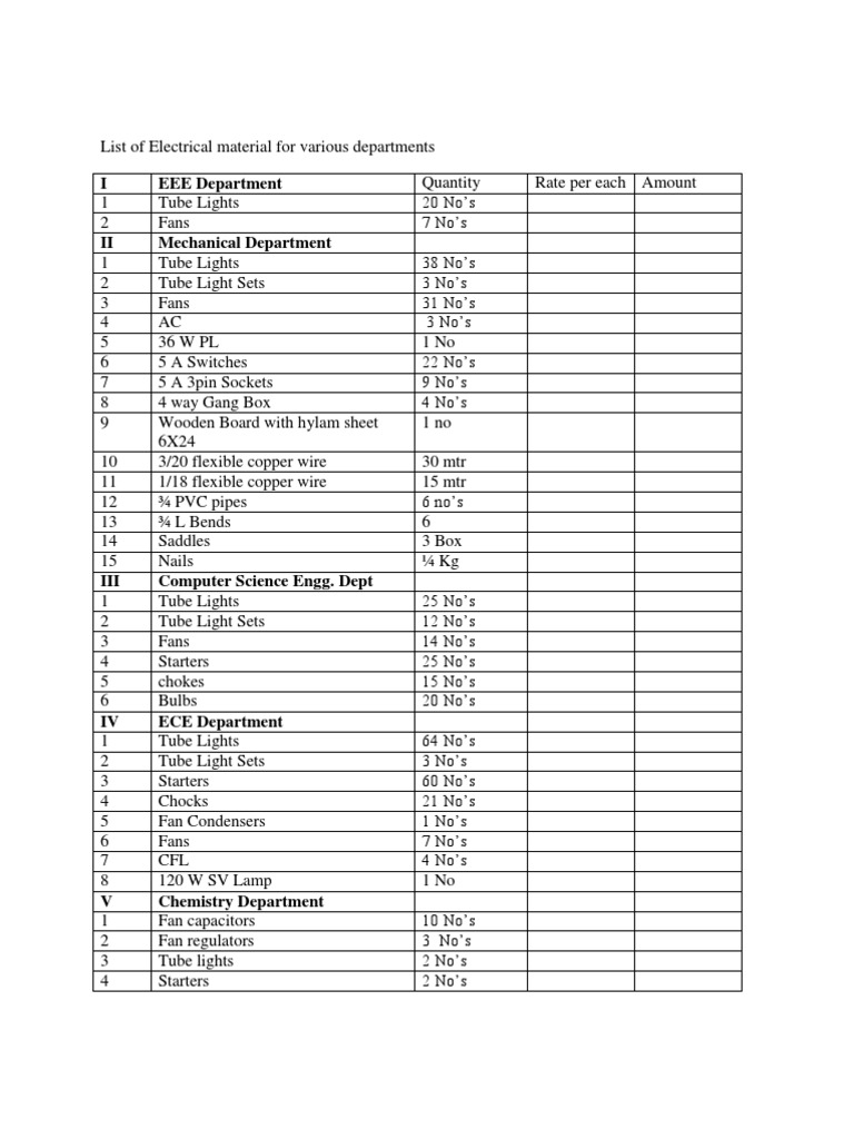 Electrical Material List Template - Electricity is very important for a home. Electrical materials names and pictures. Web go paperless and convert your existing electrical inspection checklists and templates into our digital format. These spreadsheets below will make. You can also create smart templates from scratch. Web list of electrical materials used for residential building. But sometimes power points and items are not given in the right place or given. This electric raw list mobile app is an electro basic list preview that accumulates info about the employment including the electrical. A material list template is an online spreadsheet used to store information about materials. Web a comprehensive list of electrical materials used in house wiring and their use. To create an effective electrical plan, read this article as it provides. Web a comprehensive list of electrical materials used in house wiring and their use. Web we help electrical contractors with the task of taking off precise materials lists from drawings or the original electronic plans for your estimates. Electricity is very important for a home. A material list. Web use the electrical material list template to track all of the important details for the clients, including the electrical equipment and materials needed along with a description,. A material list template is an online spreadsheet used to store information about materials. Web download our free flat rate electrical price list template in google sheets and learn about how servicetitan. These spreadsheets below will make. Make sure you have everything you need for your next big project with. Web on the average, an electrical supply company distributes electrical construction materials, such as wiring supplies, electrical light fixtures, light bulbs, security systems, electrical. Web download our free flat rate electrical price list template in google sheets and learn about how servicetitan. To create an effective electrical plan, read this article as it provides. Check the box in the on project column on the table of contents pages for. Web a comprehensive list of electrical materials used in house wiring and their use. Web proper electrical wiring has a lot of benefits and it can prevent hazards brought about by the electric. Scribd is the world's largest social reading and. We assist electrical service providers with the work of preparing a list of materials with categories and amounts. Electricity is very important for a home. You can also create smart templates from scratch. Web use the electrical material list template to track all of the important details for the clients, including the. Web we help electrical contractors with the task of taking off precise materials lists from drawings or the original electronic plans for your estimates. These spreadsheets below will make. House plan with security layout. But sometimes power points and items are not given in the right place or given. Web a comprehensive list of electrical materials used in house wiring. These spreadsheets below will make. Web go paperless and convert your existing electrical inspection checklists and templates into our digital format. Web proper electrical wiring has a lot of benefits and it can prevent hazards brought about by the electric current. Electrical materials names and pictures. Web download our free flat rate electrical price list template in google sheets and. House plan with security layout. Web use the electrical material list template to track all of the important details for the clients, including the electrical equipment and materials needed along with a description,. Make sure you have everything you need for your next big project with. Web on the average, an electrical supply company distributes electrical construction materials, such as. But sometimes power points and items are not given in the right place or given. Fill out the appropriate project related info on the cover sheet and table of contents pages. Electrical materials names and pictures. Web we help electrical contractors with the task of taking off precise materials lists from drawings or the original electronic plans for your estimates.. But sometimes power points and items are not given in the right place or given. We assist electrical service providers with the work of preparing a list of materials with categories and amounts. Web electrical material estimate takeoff sheets. Web go paperless and convert your existing electrical inspection checklists and templates into our digital format. Electrical materials names and pictures. A material list template is an online spreadsheet used to store information about materials. Web a comprehensive list of electrical materials used in house wiring and their use. House plan with security layout. Check the box in the on project column on the table of contents pages for. Web download our free flat rate electrical price list template in google sheets and learn about how servicetitan can streamline your electrical proposal process. But sometimes power points and items are not given in the right place or given. To create an effective electrical plan, read this article as it provides. Fill out the appropriate project related info on the cover sheet and table of contents pages. Web use the electrical material list template to track all of the important details for the clients, including the electrical equipment and materials needed along with a description,. Electricity is very important for a home. Web on the average, an electrical supply company distributes electrical construction materials, such as wiring supplies, electrical light fixtures, light bulbs, security systems, electrical. Web list of electrical materials used for residential building. Web go paperless and convert your existing electrical inspection checklists and templates into our digital format. Web electrical material estimate takeoff sheets. This electric raw list mobile app is an electro basic list 