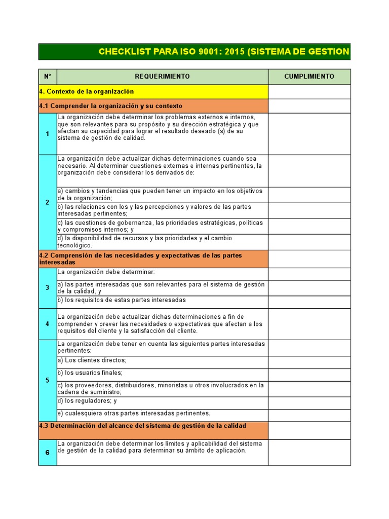 Checklist Iso 9001 2015 Gestión de la calidad Calidad