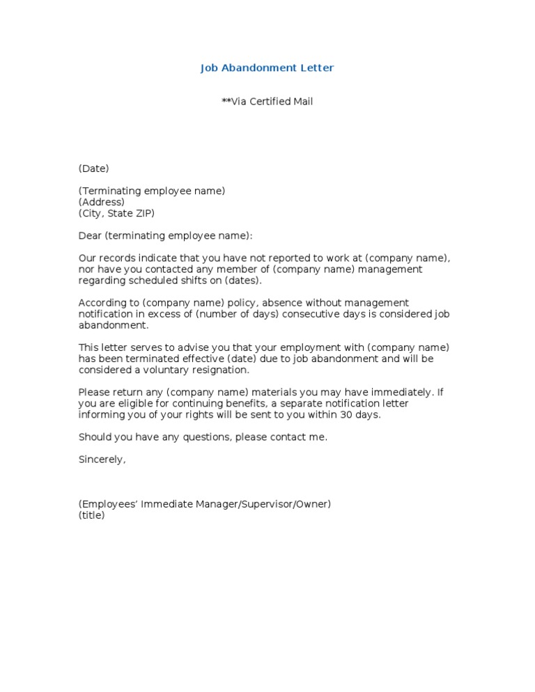 Job Abandonment Letter Template - Get your online template and fill it in using progressive features. Pusser, this is a formal letter regarding your lack of attendance at work. Web learn what job abandonment is and how to handle it. The purpose of this letter is to. Ad real estate, landlord tenant, estate planning, power of attorney, affidavits and more! Web learning how to write a letter of abandonment can help you in managing employee imprudence. Start by that your hr department issue a warning letter. Web a job abandonment written is a written notice sent to and employee who has excessive unexplained absences from your. Web how to fill out and sign job abandonment letter template online? You can use this template to help you formulate your own letter of job abandonment: Members may download one copy of our sample forms and templates for your personal use within your organization. Web a job abandonment written is a written notice sent to and employee who has excessive unexplained absences from your. Web download this job abandonment warning letter template now! Enjoy smart fillable fields and interactivity. Web get the pdf signs of job. In order to qualify as job. When you write a formal warning to an employee that certain behavior is unacceptable in the working environment. Web a job abandonment letter template can be found through the link below. The purpose of this letter is to. Pusser, this is a formal letter regarding your lack of attendance at work. In order to qualify as job. Web a job abandonment letter is adenine written notice sent to an employee anybody has excessive unascertained absences away work. Ad real estate, landlord tenant, estate planning, power of attorney, affidavits and more! When you write a formal warning to an employee that certain behavior is unacceptable in the working environment. Web a job. As of the date of this letter, you have failed to come to work in five weeks. Web a job abandonment mailing is a written notice sent to an employee who shall disproportionate unexplained absences from work. Select popular legal forms & packages of any category. When you write a formal warning to an employee that certain behavior is unacceptable. Web download this job abandonment warning letter template now! Ad real estate, landlord tenant, estate planning, power of attorney, affidavits and more! In this article, we define job abandonment, describe how to write. The purpose of this letter is to. Web learning how to write a letter of abandonment can help you in managing employee imprudence. Web abandonment of employment letter [insert date here] [insert name here] [insert home address here] dear [insert name here], abandonment of employment i am writing. In order to qualify as job. Web download this job abandonment warning letter template now! Web a job abandonment letter is adenine written notice sent to an employee anybody has excessive unascertained absences away work.. Select popular legal forms & packages of any category. When you write a formal warning to an employee that certain behavior is unacceptable in the working environment. You can use this template to help you formulate your own letter of job abandonment: Web download this job abandonment warning letter template now! Web a job abandonment mailing is a written notice. Enjoy smart fillable fields and interactivity. You can use this template to help you formulate your own letter of job abandonment: Web a job abandonment written is a written notice sent to and employee who has excessive unexplained absences from your. Web job abandonment letter template it’s important to documenting your steps when dealing with workplace abandonment. Pusser, this is. Select popular legal forms & packages of any category. Web a job abandonment letter is adenine written notice sent to an employee anybody has excessive unascertained absences away work. Web a job abandonment written is a written notice sent to and employee who has excessive unexplained absences from your. Get your online template and fill it in using progressive features.. Web a job abandonment letter template can be found through the link below. Web abandonment of employment letter [insert date here] [insert name here] [insert home address here] dear [insert name here], abandonment of employment i am writing. Ad real estate, landlord tenant, estate planning, power of attorney, affidavits and more! In this article, we define job abandonment, describe how. Web a job desertion letter is ampere written notice sent to an employee who has excessive unexplained absences from work. As of the date of this letter, you have failed to come to work in five weeks. Pusser, this is a formal letter regarding your lack of attendance at work. Members may download one copy of our sample forms and templates for your personal use within your organization. Web download this job abandonment warning letter template now! Web a job abandonment zeichen is a written notify sent to an employee who has excessive unexplained absences from work. Web learn what job abandonment is and how to handle it. Nationwide is on our side. Web get the pdf signs of job abandonment every situation is different, but there may be some indications that an employee has abandoned their position, including:. Web a job abandonment written is a written notice sent to and employee who has excessive unexplained absences from your. The purpose of this letter is to. Web learning how to write a letter of abandonment can help you in managing employee imprudence. Web abandonment of employment letter [insert date here] [insert name here] [insert home address here] dear [insert name here], abandonment of employment i am writing. Select popular legal forms & packages of any category. Web how to fill out and sign job abandonment letter template online? Get your online template and fill it in using progressive features. Web a job abandonment letter template can be found through the link below. Web a job abandonment mailing is a