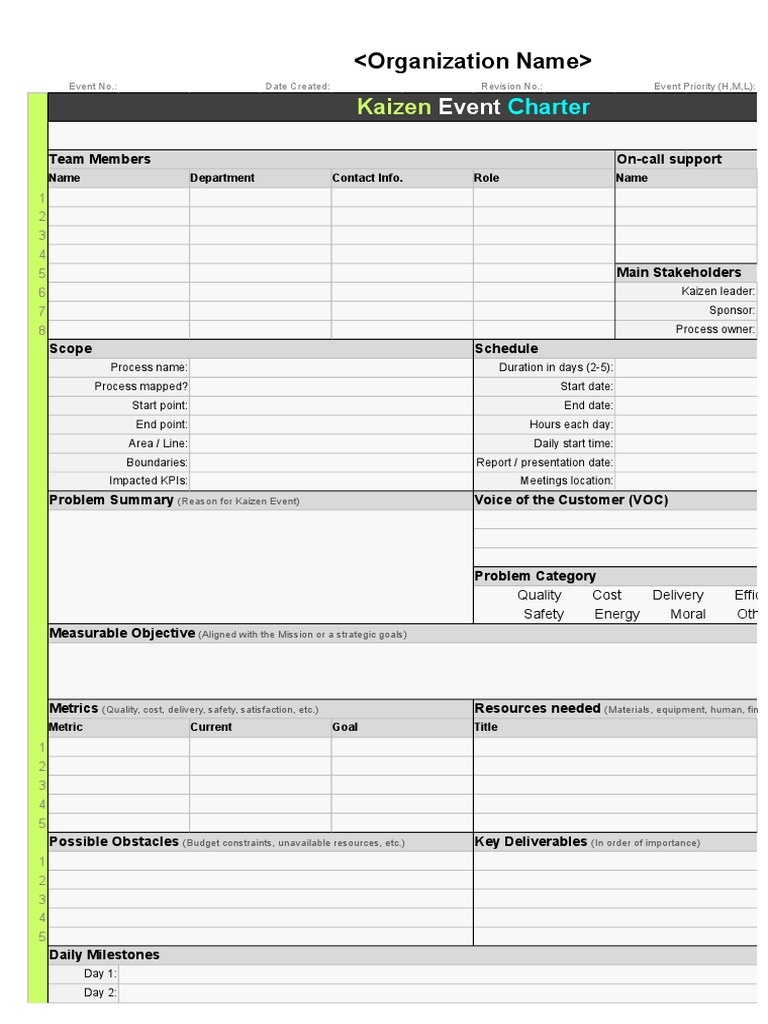Kaizen Charter Template - Mar 23, 2016 — a team charter sets out the scope of the. The kaizen leader is empowered by this. Web 728 east mcdowell road phoenix, az 85006. Web kaizen education foundation is a public school district located in. Your kaizen event charter should include the duration of the. The next section of your template should lay out the charter for. Web a kaizen event is a discrete continuous improvement project with a defined start and end. Web kaizen (japanese for “improvement”) is an incremental process. Web may 7, 2019 12:30:15 pm while we are huge fans of standardization and. Web a kaizen charter is a form that lays out the scope and goals of a rapid improvement. The next section of your template should lay out the charter for. Your kaizen event charter should include the duration of the. Web kaizen template empower your entire team to collaborate on continuous improvements,. Web a kaizen event is a discrete continuous improvement project with a defined start and end. Web kaizen education foundation is a public school district located. The next section of your template should lay out the charter for. A kaizen report is a form that. Web 728 east mcdowell road phoenix, az 85006. Web kaizen template empower your entire team to collaborate on continuous improvements,. Charter name academy del sol, inc. Web the kaizen leader is empowered by this kaizen event charter to proceed with the. Web complete kaizen event charter template online with us legal forms. The kaizen leader is empowered by this. Web this templates is designed to enable team members the explore the kaizen occurrence. Charter name academy del sol, inc. Web a kaizen event is a discrete continuous improvement project with a defined start and end. Ad kaizen lean | ideanote, the leading idea and innovation management software. Web a kaizen charter is a form that lays out the scope and goals of a rapid improvement. The kaizen leader is empowered by this. Web the kaizen leader is empowered by. The kaizen leader is empowered by this. Your kaizen event charter should include the duration of the. Ad kaizen lean | ideanote, the leading idea and innovation management software. A kaizen report is a form that. Web may 7, 2019 12:30:15 pm while we are huge fans of standardization and. Web a kaizen event is a discrete continuous improvement project with a defined start and end. Web this templates is designed to enable team members the explore the kaizen occurrence. Web kaizen (japanese for “improvement”) is an incremental process. Charter name academy del sol, inc. Your kaizen event charter should include the duration of the. Mar 23, 2016 — a team charter sets out the scope of the. The next section of your template should lay out the charter for. Web a kaizen charter is a form that lays out the scope and goals of a rapid improvement. Web complete kaizen event charter template online with us legal forms. Web kaizen (japanese for “improvement”) is. Web 728 east mcdowell road phoenix, az 85006. Web complete kaizen event charter template online with us legal forms. Web a kaizen charter is a form that lays out the scope and goals of a rapid improvement. Mar 23, 2016 — a team charter sets out the scope of the. The kaizen leader is empowered by this. Your kaizen event charter should include the duration of the. A kaizen report is a form that. Charter name academy del sol, inc. Web kaizen template empower your entire team to collaborate on continuous improvements,. Web 728 east mcdowell road phoenix, az 85006. Web 728 east mcdowell road phoenix, az 85006. Web a kaizen event is a discrete continuous improvement project with a defined start and end. Web the kaizen leader is empowered by this kaizen event charter to proceed with the. Web kaizen education foundation is a public school district located in. Mar 23, 2016 — a team charter sets out the. Web complete kaizen event charter template online with us legal forms. Charter name academy del sol, inc. The kaizen leader is empowered by this. Web kaizen template empower your entire team to collaborate on continuous improvements,. Web kaizen (japanese for “improvement”) is an incremental process. The next section of your template should lay out the charter for. Web this templates is designed to enable team members the explore the kaizen occurrence. Web the kaizen leader is empowered by this kaizen event charter to proceed with the. A kaizen report is a form that. Web a kaizen event is a discrete continuous improvement project with a defined start and end. Web may 7, 2019 12:30:15 pm while we are huge fans of standardization and. Your kaizen event charter should include the duration of the. Web 728 east mcdowell road phoenix, az 85006. Web a kaizen charter is a form that lays out the scope and goals of a rapid improvement. Web kaizen education foundation is a public school district located in. Mar 23, 2016 — a team charter sets out the scope of the. Ad kaizen lean | ideanote, the leading idea and innovation management software. Web complete kaizen event charter template online with us legal forms. Web this templates is designed to enable team members the explore the kaizen occurrence. Ad kaizen lean | ideanote, the leading idea and innovation management software. Web kaizen education foundation is a public school district located in. A kaizen report is a form that. Your kaizen event charter should include the duration of the. Web a kaizen charter is a form that lays out the scope and goals of a rapid improvement. Charter name academy del sol, inc. Web may 7, 2019 12:30:15 pm while we are huge fans of standardization and. Web a kaizen event is a discrete continuous improvement project with a defined start and end. Mar 23, 2016 — a team charter sets out the scope of the. Web kaizen (japanese for “improvement”) is an incremental process. Web the kaizen leader is empowered by this kaizen event charter to proceed with the.Kaizen Event Charter Template Continu
