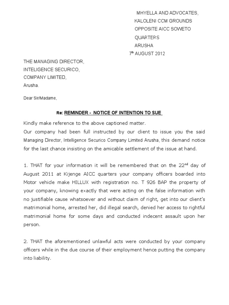 Letter Of Intent To Sue Template