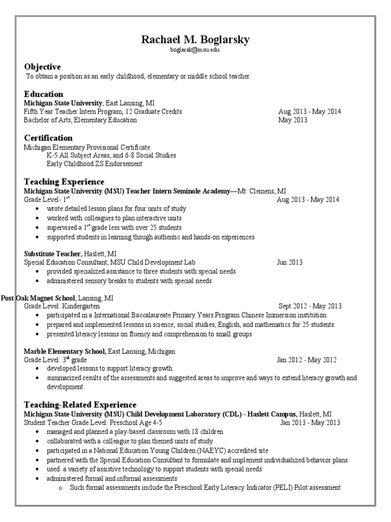 resume elementary education 2 Special Education Michigan State