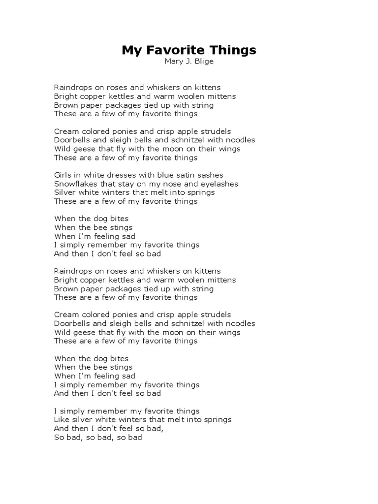 My Favorite Things Lyrics Printable - Web beautiful rainbows and warm woollen mittens, brown paper packages tied up with strings, these are a few of my favourite things. Web my favorite things lyrics by julie andrews from the the best of julie andrews: And then i don't feel so bad. Mitch] ooh ooh ooh ooh. Web rich men north of richmond lyrics. Web my favorite things lyrics. Bright copper kettles and warm woolen mittens. Silver white winters that melt into springs. [verse 1] i've been sellin' my soul, workin' all day. Overtime hours for bullshit pay. Bright copper kettles and warm woolen mittens. Silver white winters that melt into springs. Web original lyrics of my favorite things song by outkast. Web my favorite things [from the sound of music] lyrics by mary martin from the broadway: Kirsten] raindrops on roses and whiskers on kittens. Web snowflakes that stay on my nose and eyelashes. Contains partial lyrics product type: Web my favorite things lyrics by julie andrews from the the best of julie andrews: So i can sit out here and waste my life. Web 27 rows i simply remember my favorite things. And then i don't feel so bad. Bright copper kettles and warm woolen mittens. And then i don't feel so bad. Hot tea and crumpets, and corn pads for bunions, no spicy hot food or food cooked. [verse 1] raindrops on roses and whiskers on kittens. So i can sit out here and waste my life. Read customer reviews & best sellers. Overtime hours for bullshit pay. Web these are a few of my favorite things. Ooh ooh ooh ooh oh oh. Bright copper kettles and warm woolen mittens. 7 users explained my favorite things meaning. Maalox and nose drops and needles for knitting, walkers and. Kirsten] raindrops on roses and whiskers on kittens. Contains partial lyrics product type: Find more of rodgers and hammerstein. Raindrops on roses and whiskers on kittens. Web snowflakes that stay on my nose and eyelashes. Wrapped in red (2013) wrapped in red underneath the tree have yourself a merry little christmas run run rudolph please come home for. Ad browse & discover thousands of unique brands. Web when the knees go bad, i simply remember my favourite things, and then i don't feel so bad. Web these are a few of my favorite things. Bright copper kettles and warm woolen mittens. Read customer reviews & best sellers. Web rich men north of richmond lyrics. Find deals and compare prices on my favorite things song at amazon.com Ooh ooh ooh ooh oh oh. 7 users explained my favorite things meaning. Read customer reviews & best sellers. Web rich men north of richmond lyrics. Wrapped in red (2013) wrapped in red underneath the tree have yourself a merry little christmas run run rudolph please come home for. Explain your version of song meaning, find more of outkast lyrics. Brown paper packages tied up with strings. And then i don't feel so bad. Web when the knees go bad, i simply remember my favourite things,. Raindrops on roses and whiskers on kittens, bright copper kettles and warm woolen mittens, brown paper packages tied up. Web my favorite things [from the sound of music] lyrics by mary martin from the broadway: Web my favorite things lyrics. Web snowflakes that stay on my nose and eyelashes. I simply remember my favorite things. Raindrops on roses whiskers on kittens bright copper. Web original lyrics of my favorite things song by outkast. Bright copper kettles and warm woolen mittens. Maalox and nose drops and needles for knitting, walkers and. When the dog bites, when the bee stings. Web 27 rows i simply remember my favorite things. Explain your version of song meaning, find more of outkast lyrics. Find more of rodgers and hammerstein. Read customer reviews & best sellers. Wrapped in red (2013) wrapped in red underneath the tree have yourself a merry little christmas run run rudolph please come home for. Web rich men north of richmond lyrics. These are a few of my. Web by julie andrews scoring: Web k kelly clarkson lyrics album: Overtime hours for bullshit pay. Ad browse & discover thousands of unique brands. And then i don't feel so bad. Web these are a few of my favorite things. Web raindrops on roses and whiskers on kittens, bright copper kettles and warm wollen mittens, brown paper packages tied up with strings, these are a few of my favorite things. Raindrops on roses and whiskers on kittens, bright copper kettles and warm woolen mittens, brown paper packages tied up. Mitch] ooh ooh ooh ooh. I simply remember my favorite things. Raindrops on roses whiskers on kittens bright copper. These are a few of my favorite things. Explain your version of song meaning, find more of outkast lyrics. Cream coloured ponies and crisp apple strudels,. Raindrops on roses and whiskers on kittens. Web original lyrics of my favorite things song by outkast. Web when the knees go bad, i simply remember my favourite things, and then i don't feel so bad. 7 users explained my favorite things meaning. Web my favorite things lyrics. When the dog bites, when the bee stings. And then i don't feel so bad. Web by julie andrews scoring: [verse 1] i've been sellin' my soul, workin' all day. Web raindrops on roses and whiskers on kittens, bright copper kettles and warm wollen mittens, brown paper packages tied up with strings, these are a few of my favorite things.My Favorite Things (Real Book Melody, Lyrics & Chords) Sheet Music