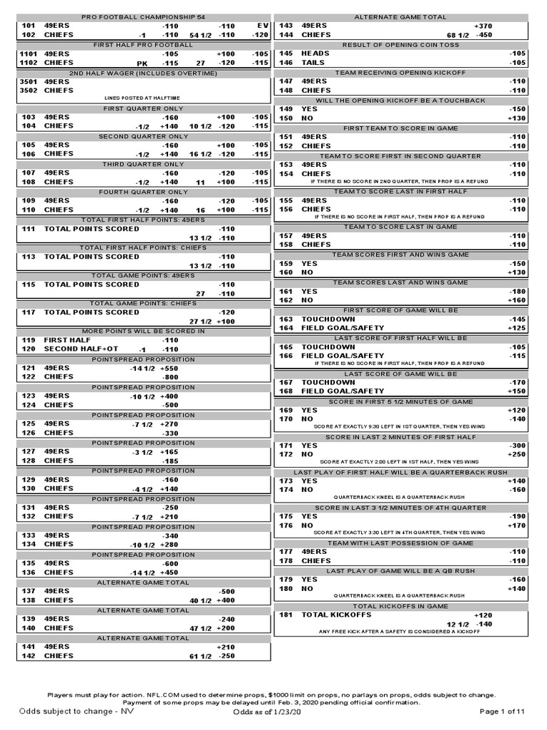 Universal Super Bowl Prop Bets 2020 Printable Tristan Website