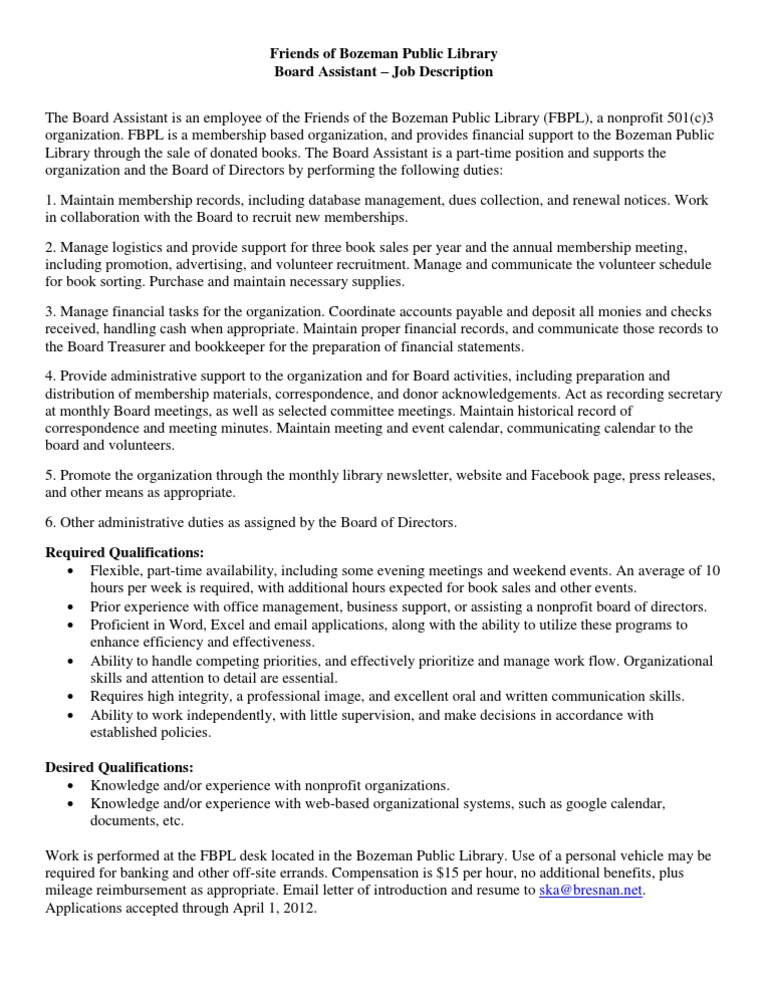 FBPL Board Assistant Job Description Board Of Directors Nonprofit