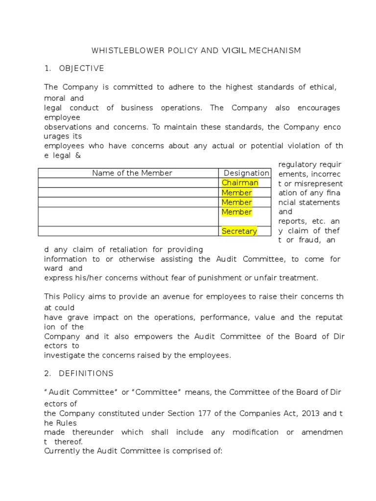 Sample Whistle Blower Policy Whistleblower Board Of Directors