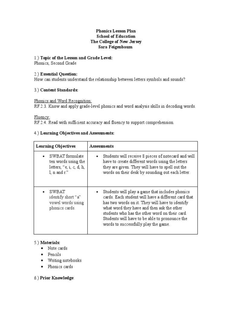 Sample Kindergarten Phonics Lesson Plan Lesson Plans Learning