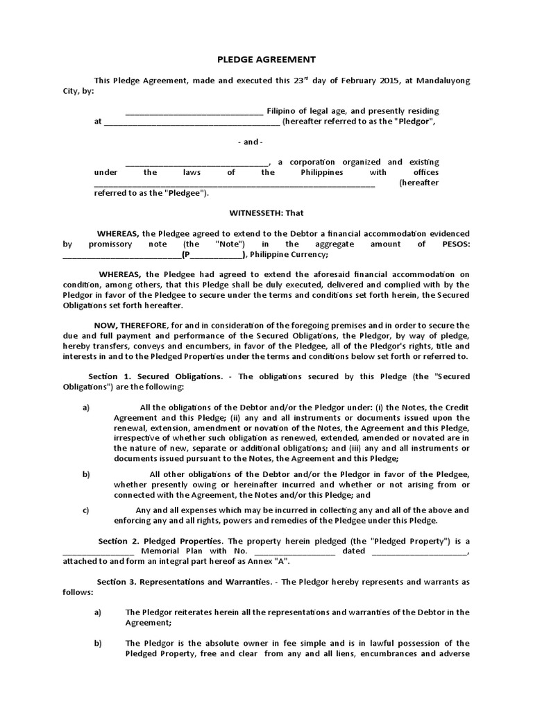 Web A Pledge Agreement Is An Agreement Drawn Between A Borrower And A Lender, Whereby The Borrower Pledges Some Personal Property To Guarantee The Loan.