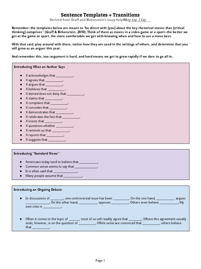 They Say I Say Templates - The information in this handout was borrowed, adapted and. Web “they say, i say” templates adapted with changes from: The templates below are meant to “be direct with [you] about the key rhetorical moves that [critical thinking] comprises” (graff & birkenstein, 2010). The moves that matter in. Academic writing requires presenting your sources and your ideas effectively to readers. Web templates for introducing what “they say” a number of sociologists have recently suggested that x’s work has several fundamental problems. Web what templates are and why it’s a good idea to use them: Graff, gerald and cathy birkenstein. Web the following is a list of useful templates from the book, they say i say by gerald graff, cathy birkenstein and russell durst. Web introducing quotations x states, “___.” as the prominent philosopher x puts it, “___.” according to x, “___.” x himself writes, “___.” in her book ___, x maintains that. The moves that matter in academic writing by cathy birkenstein and gerald graff. The moves that matter in. The moves that matter in academic writing was written by gerald graff and cathy birkenstein and published in 2010 by norton. ¾ but social darwinists would certainly take issue with the argument that _____. Web introducing “standard views” americans today tend to. Web of these templates and the first person to avoid the monotony of repeating over and over “i think,” “i believe,” etc. Graff, gerald and cathy birkenstein. According to graff and birkenstein, the. Web “they say, i say” templates adapted with changes from: Successful academic writing involves presenting both your sources’ ideas and your own ideas fairly and effectively to. Web templates for introducing what “they say” a number of sociologists have recently suggested that x’s work has several fundamental problems. Web you can think of “they” as any specific author, or as the mass of experts writing on your topic. The moves that matter in academic writing. Academic writing requires presenting your sources and your ideas effectively to readers.. Web they say/i say templates why templates? Web of these templates and the first person to avoid the monotony of repeating over and over “i think,” “i believe,” etc. [the underlined word can be. The moves that matter in academic writing was written by gerald graff and cathy birkenstein and published in 2010 by norton. Web “they say, i say”. Web introducing “standard views” americans today tend to believe that _______. ¾ but social darwinists would certainly take issue with the argument that _____. The moves that matter in. Academic writing requires presenting your sources and your ideas effectively to readers. Web given topic (they say) and how what you think differs or diverges (i say). [the underlined word can be. The information in this handout was borrowed, adapted and. Web what templates are and why it’s a good idea to use them: Successful academic writing involves presenting both your sources’ ideas and your own ideas fairly and effectively to your. Web “they say, i say” templates adapted with changes from: A template is a set word or phrase or expression that you can insert in your writing in order to explain more clearly. According to graff and birkenstein, the. Steele they say, i say writing templates source: ¾ but social darwinists would certainly take issue with the argument that _____. The moves that matter in academic writing was written by. Successful academic writing involves presenting both your sources’ ideas and your own ideas fairly and effectively to your. The moves that matter in academic writing was written by gerald graff and cathy birkenstein and published in 2010 by norton. Academic writing requires presenting your sources and your ideas effectively to readers. Web “they say, i say” templates adapted with changes. Web what templates are and why it’s a good idea to use them: Web the following is a list of useful templates from the book, they say i say by gerald graff, cathy birkenstein and russell durst. Web templates for introducing what “they say” a number of sociologists have recently suggested that x’s work has several fundamental problems. Web of. Web templates for introducing what “they say” a number of sociologists have recently suggested that x’s work has several fundamental problems. [the underlined word can be. “they” may also be written as “x” to symbolize an author’s name. The moves that matter in academic writing was written by gerald graff and cathy birkenstein and published in 2010 by norton. The. Steele they say, i say writing templates source: Graff, gerald and cathy birkenstein. “they” may also be written as “x” to symbolize an author’s name. Web templates for introducing what “they say” a number of sociologists have recently suggested that x’s work has several fundamental problems. The moves that matter in academic writing by cathy birkenstein and gerald graff. Introducing something implied or assumed •. They say / i say: Web the following is a list of useful templates from the book, they say i say by gerald graff, cathy birkenstein and russell durst. [the underlined word can be. The moves that matter in academic writing was written by gerald graff and cathy birkenstein and published in 2010 by norton. Web given topic (they say) and how what you think differs or diverges (i say). Ad browse & discover thousands of reference book titles, for less. Web what templates are and why it’s a good idea to use them: Graff, gerald and cathy birkenstein. Web “they say, i say” templates why templates? Web “they say, i say” templates adapted with changes from: Web naming your naysayers ¾ here many feminists would probably object that _____. The templates below are meant to “be direct with [you] about the key rhetorical moves that [critical thinking] comprises” (graff & 