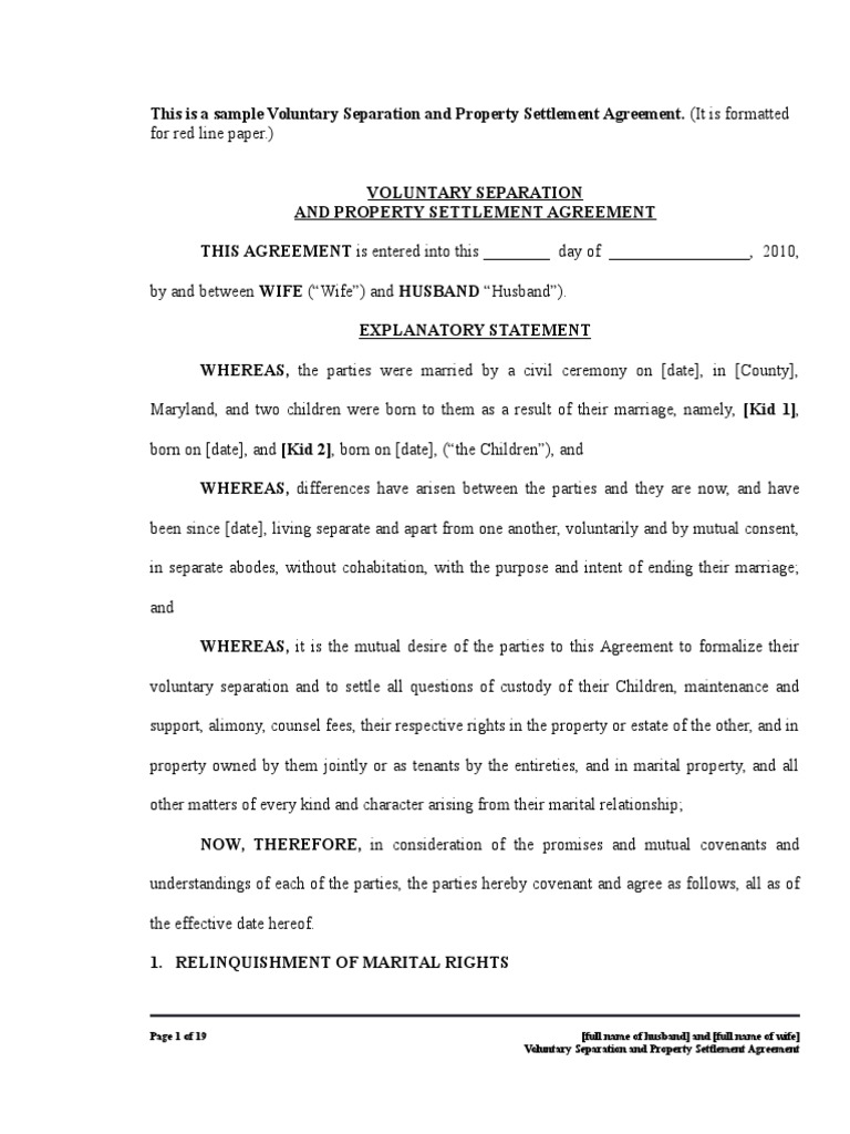 Sample Voluntary Separation and Property Settlement Agreement